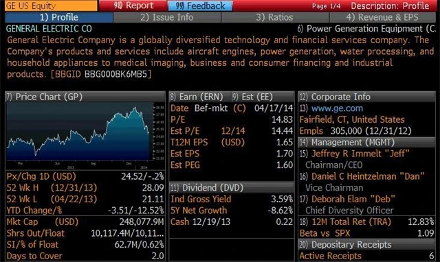 Berkshire drží 588 900 akcií této společnosti v hodnotě přes 15,2 milionu USD. Analytici jsou ohledně GE názorově roztříštění, býci každopádně vyzdvihují stabilitu, velikost, pozici na trhu, podprůměrné valuace a dividendový výnos.