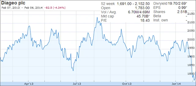 Firma koncem ledna oznámila růst zisku i tržeb. Paradoxně největší růst zažívají severoamerické prodeje, což znamená, že si Američané značky Diageo již oblíbili. Větší ochlazení mladých trhů by mohlo negativně ovlivnit zisk firmy i cenu akcií. Nízkou cenu lze ale využít jako příležitost k nákupu.