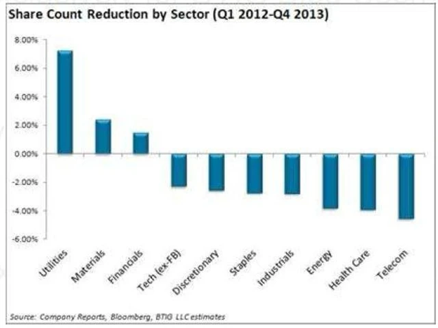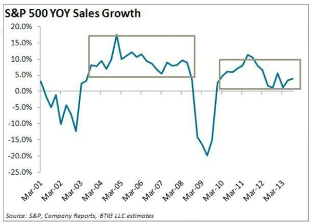 Podle Greenhause mají přitom růst zisků na svědomí především zpětné odkupy akcií. "Odkupy akcií nepřestávají hnát zisky na akcii vzhůru (akcií na trhu totiž ubývá). Zatímco zisky rostly v jednotkách procent, tržby se zvýšily jen mírně - odhady překonaly jen o 0,8 %. Očekávání nenaplnily především energetické firmy a sektor spotřebního zboží," říká Greenhaus.