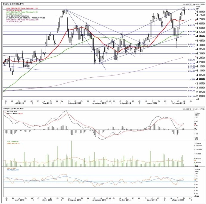 Technická analýza cen akcií ČEZ a Komerční banky. (25. 3. 2014)