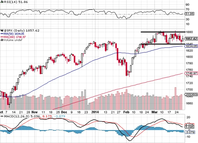 Index S&P 500 se už déle než měsíc obchoduje v rozpětí 1 880 až 1 840. Indikátory VIX, MACD a put/call ratio dávají odlišné signály. Nejdůležitější je ovšem cenový graf, a proto další vývoj naznačí až prolomení zmíněného rozpětí.