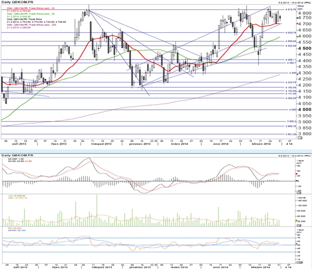 Technická analýza cen akcií ČEZ a Komerční banky. (1. 4. 2014)