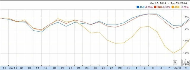 V pondělí se Nasdaq propadl až ke 4 054 bodům. Prošel si tak třemi nejhoršími dny v řadě od roku 2011. I když se v následujících dnech technologické akcie trochu vzpamatovaly, je Nasdaq za poslední měsíc 3,5 % v mínusu (Nasdaq 100 -2,8 %) a zaostává za dalšími dvěma klíčovými americkými indexy S&P 500 a Dow.