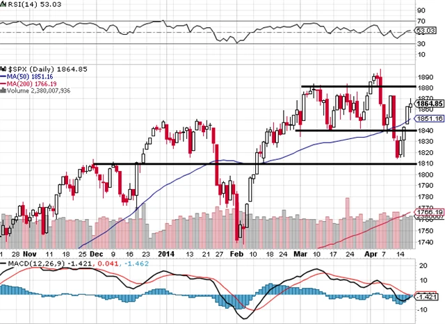 Situace z února se v dubnu opakuje jako přes kopírák. Index se vrátil nad 50denní klouzavý průměr a přesně do poloviny předchozího rozpětí 1 880 až 1 840. Po rychlém výprodeji se situace zklidnila a následovala opačná reakce. Býci se oklepali rychle. Nejprve falešné prolomení nahoru, o týden později dolů. Některé indikátory se vrátily do býčího nastavení, graf je neutrální a přetahovaná pokračuje.