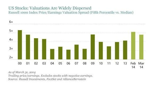 Nejdražší akcie se prodávají s valuacemi, které jsou 4,8krát vyšší, než je medián trhu. To je více než před začátkem finanční krize a jen o něco méně než před splasknutím technologické bubliny.