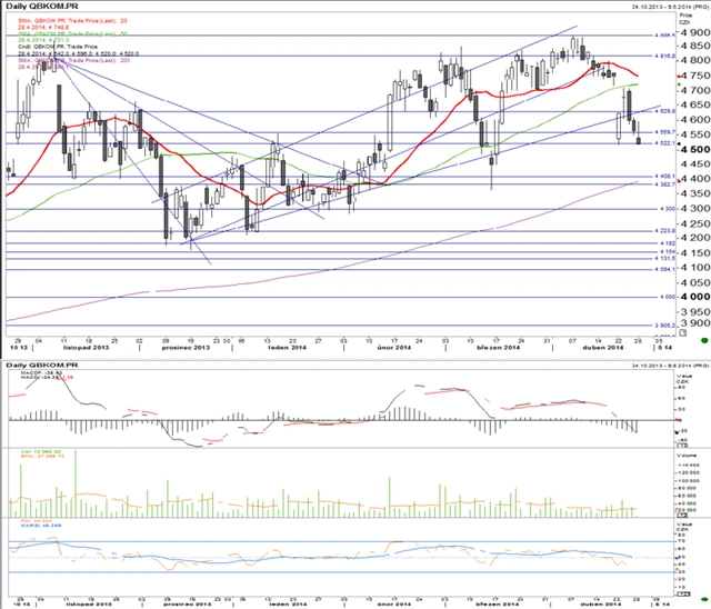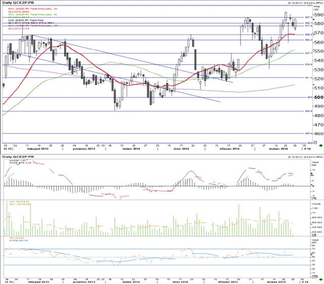 Technická analýza cen akcií ČEZ a Komerční banky. (29. 4. 2014)