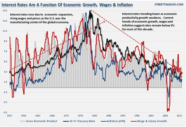 Není žádným překvapením, že mezi třemi komponentami (inflací a ekonomickým a mzdovým růstem) a úrovní úrokových sazeb existuje vysoká korelace. Úrokové sazby nejsou jen funkcí trhu investic, ale spíše úrovně poptávky po kapitálu v ekonomice.