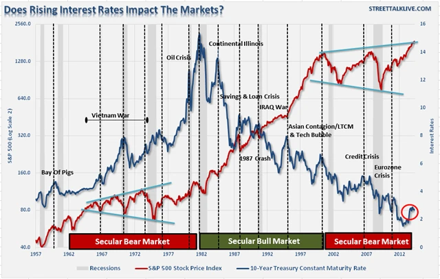- Jeden z hlavních argumentů akciových býků během posledních 5 let byl ten, že akcie jsou levné vlivem nízkých úrokových sazeb. Když sazby vzrostou, akciový trh začne být velmi rychle nadhodnocený.