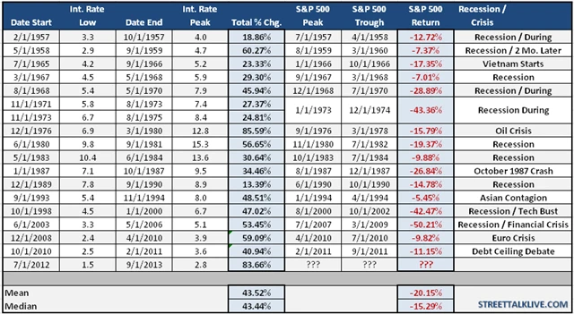 Graf a tabulka níže naznačují, jaký dopad může mít na finanční trhy a ekonomiku růst úrokových sazeb.