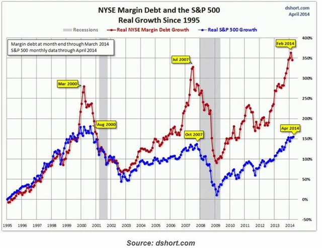 Maržové obchody, kdy si investoři na nákup akcií půjčují a využívají pákového efektu, se drží poblíž rekordu. Při minulých dvou tržních vrcholech v roce 2000 a 2007 přitom maržové obchody dosáhly vrcholu jen několik měsíců před zhroucením trhů.