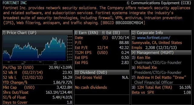 Společnost s 3,4miliardovou tržní kapitalizací, která se specializuje na bezpečnost sítí. Zaměřuje se na jednotné řízení bezpečnostních hrozeb, což znamená, že firewall je integrován do jednoho produktu, který zároveň hrozby detekuje a brání napadání systému. Firma nabízí množství softwaru pro kontrolu aplikací a firewallu, vlajkovou lodí je ale FortiGate, síťová bezpečnostní platforma, která je určena širokému spektru firem od malých kanceláří a maloobchodníků po velké podniky a datová centra.