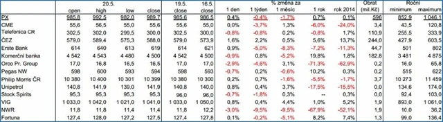 Přehlednou tabulku, která parket burzy v Praze rozděluje na vítěze, poražené a "klidný" střed, ve svém ranním shrnutí dění na trzích nabídli analytici z České spořitelny.