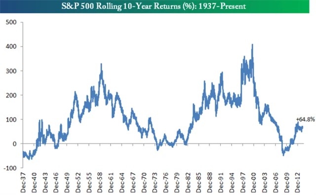 Od roku 1937 je průměr 10letého zhodnocení cen akcií podle indexu S&P 500 103 %. Za uplynulých 10 let dosahuje výnos aktuálně jen kolem 65 %. Podpis krachu Lehman Brothers je i po téměř šesti letech na trzích jasně čitelný.