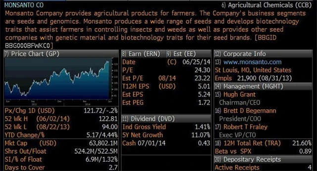 Největší společností ze sektoru je Monsanto. Posledních několik let bylo pro její akcie úspěšných - po pádu na dno v roce 2010 se cena v následujících letech vyšplhala na dvojnásobek. Stál za tím hlavně solidní růst tržeb a zisku. Nyní firma roste mnohem pomaleji, takže dokonce i přehnaně optimističtí analytici z Wall Street ve svých predikcích brzdí a vidí pro následujících několik let růst jen kolem 5 %. Celosvětová nedůvěra ke GMO potravinám (potravinám na bázi geneticky modifikovaných organismů) přitom může vést k tomu, že nebudou naplněny ani nejpesimističtější odhady hospodaření firmy.