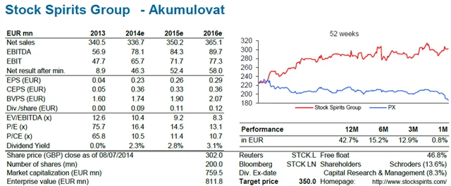 Stock Spirits plánuje vyplácet 35% svého volného cash flow na dividendách, zbytek chce použít na financování akvizičního růstu. **"Pro rok 2014 čekáme dividendu 0,09 EUR na akcii (2,3% dividendový výnos), následně pak 0,11 EUR na akcii v roce 2015 (2,8% dividendový výnos)," uvádí Kmínek.