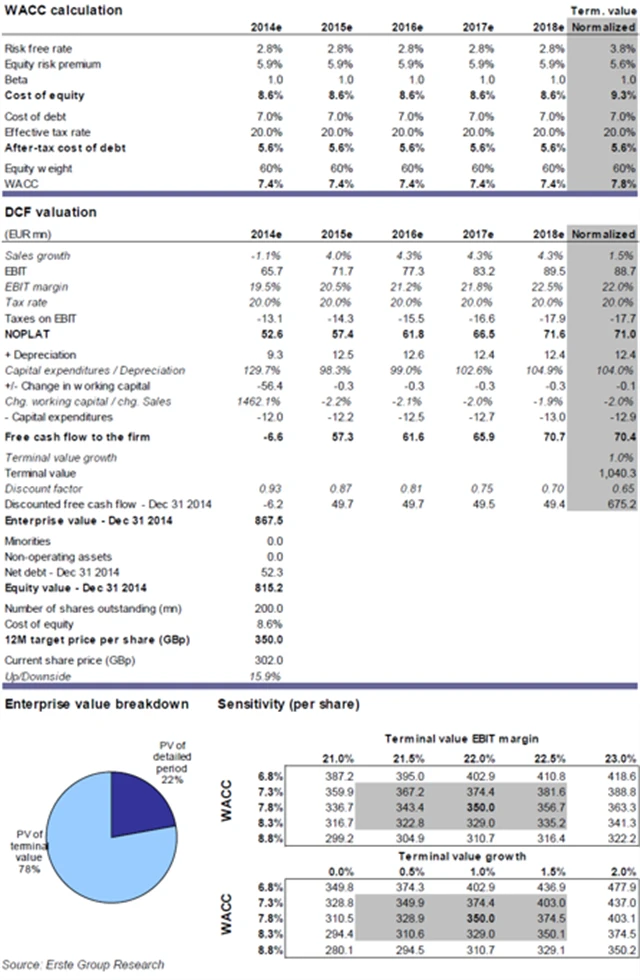 Ocenění společnosti Stock Spirits Group je založeno na dvojfázovém DCF modelu, který je podle Erste nejvhodnější pro zachycení hodnoty společnosti. Model ocenil společnost na 815,2 milionu EUR, což po přepočtení znamená 350 GBp na akcii.