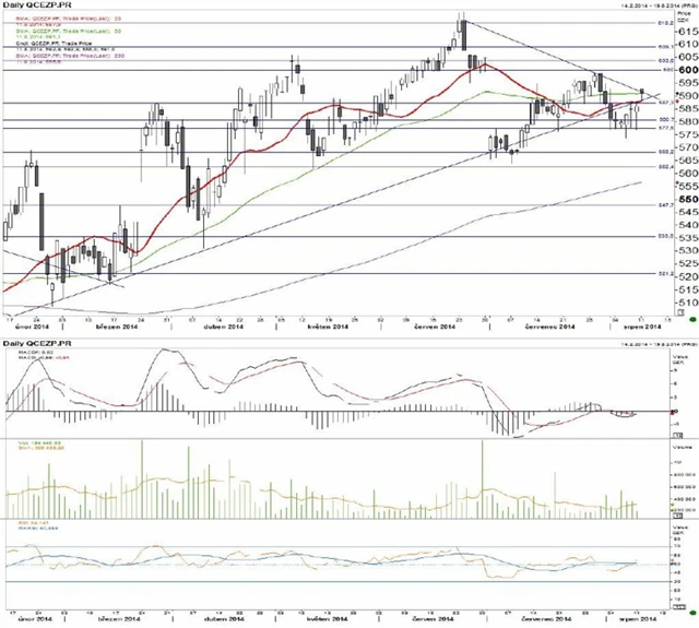 Technické indikátory se celkově zlepšují, klíčovou událostí ale budou výsledky za 2. kvartál. Čistě podle technických indikátorů bychom se přikláněli spíše ke scénáři, že ČEZ bude pokračovat v růstu. Největší vliv na další vývoj ale tentokrát budou mít fundamenty, tedy výsledky za 2Q2014, které vycházejí 12. srpna.