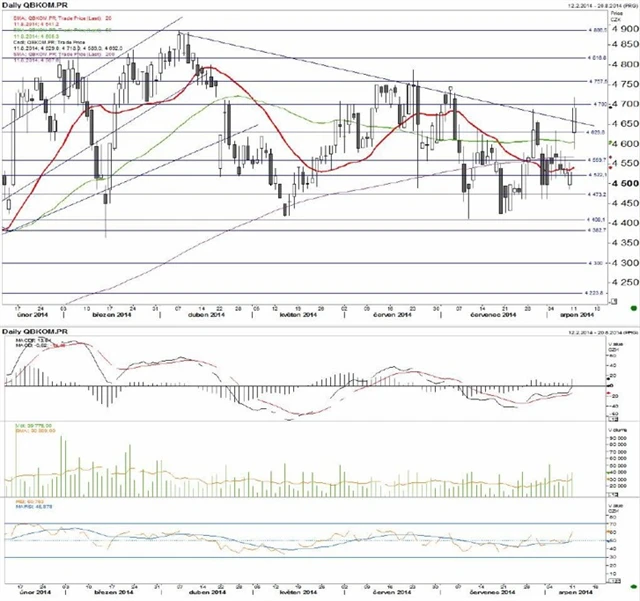 Technická analýza cen akcií ČEZ a Komerční banky. (11. 8. 2014)