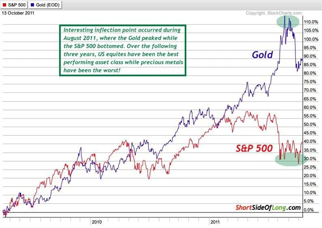 Přesně před třemi lety, v srpnu 2011, nastala zajímavá věc. Obavy z možné neschopnosti USA splácet dluhy a pokračující krize v eurozóně vyvolaly poslední výraznou korekci indexu S&P 500. Zlato v té době zafungovalo jako bezpečný přístav a jeho cena začala prudce růst.