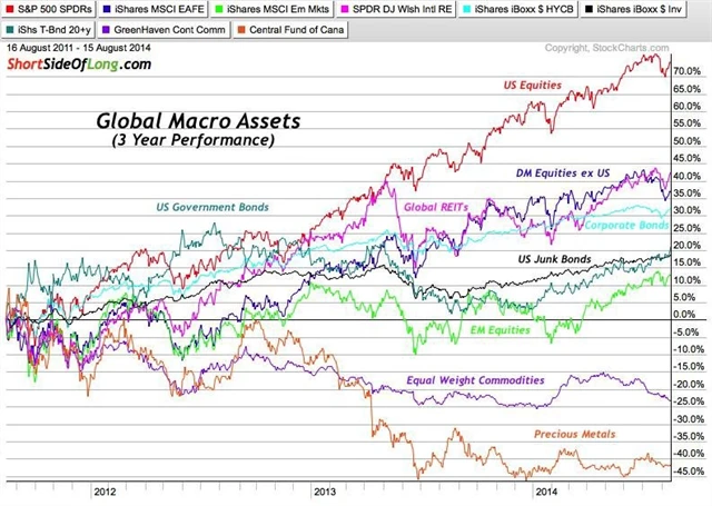 O tři roky později jsou drahé kovy jedním z nejhůře vynášejících aktiv vůbec. Americké akcie patří naopak k nejlepším, když index S&P 500 přidal za poslední tři roky přes 75 %.