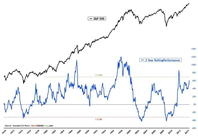 Následující dva grafy ukazují 3leté rolované výnosy indexu S&P 500 a zlata. Z grafu akciového indexu plyne, že cenné papíry teď v 3letém horizontu nabízejí ve srovnání s minulostí velmi vysoké výnosy.