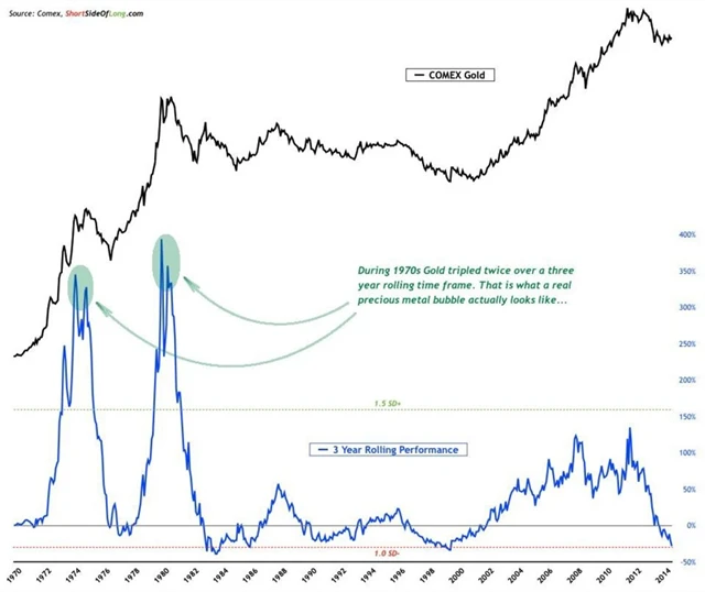 Je také možné, že pokles ceny zlata za poslední tři roky byl jen korekcí v rámci dlouhodobého býčího trhu. Když se totiž podíváme na graf, uvidíme, že zřejmě nejde o splasknutí bubliny. To nastalo dvakrát v 70. letech a vypadalo to úplně jinak.