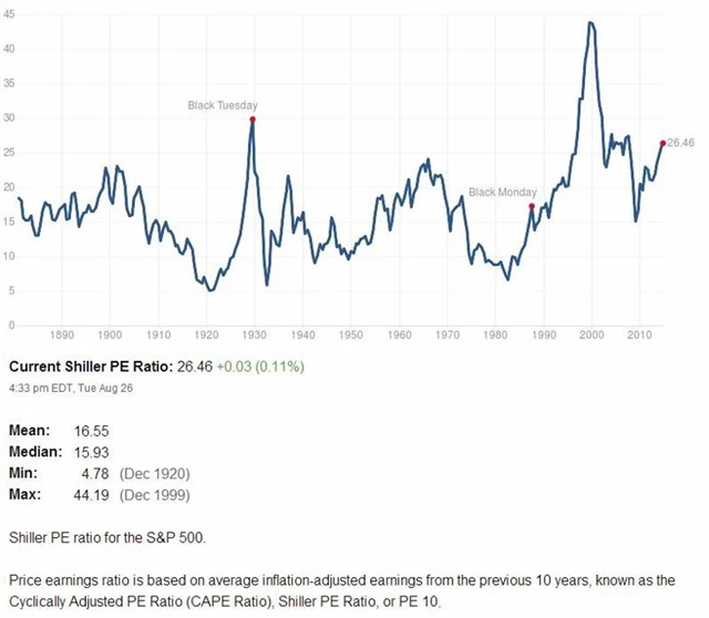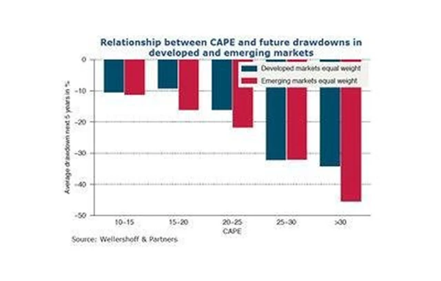 Cyklicky očištěný P/E poměr (CAPE) Roberta Shillera nevěstí pro akcie nic dobrého. Valuace na americkém trhu jsou vysokých úrovních a Wellershoff & Partners odhalili, že po dosažení srovnatelně vysokých valuací CAPE vykazoval S&P 500 průměrný pokles v dalších pěti letech o 30 až 35 %. Když bylo naopak CAPE nižší než 15, průměrný pokles během pěti let nepřesahoval 10 %.