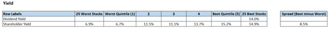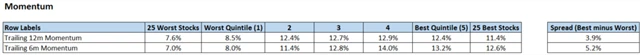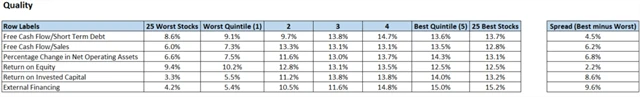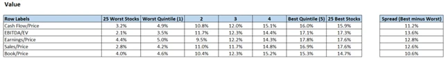 Všech pět hodnotových faktorů může upozornit na akcie překonávající průměr sektoru, nicméně EBITDA/EV funguje nejlépe. Analýza se dívá zpětně až do roku 1963 a kvintily byly na klouzavé roční bázi rebalancovány (to samé platí pro ostatní tabulky).