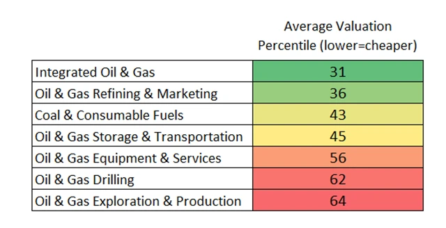V následující grafice najdete barevně odlišené historické valuační percentily pro různé subsektory v rámci energetiky (průměr za celou periodu a časové řady).