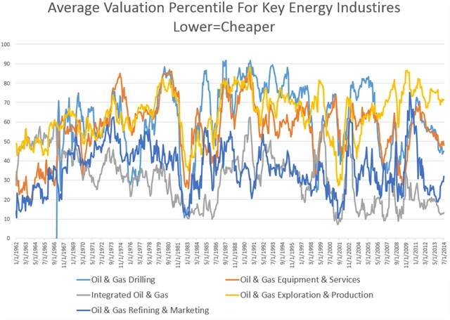 Valuace energetických akcií značně kolísají. Sledujte černou linii v níže uvedeném grafu - ve vztahu k ostatním akciím patřily energie někdy mezi nejdražší sektory trhu (70. a 90. léta), jindy mezi nejlevnější (polovina 60. let a 80. léta).