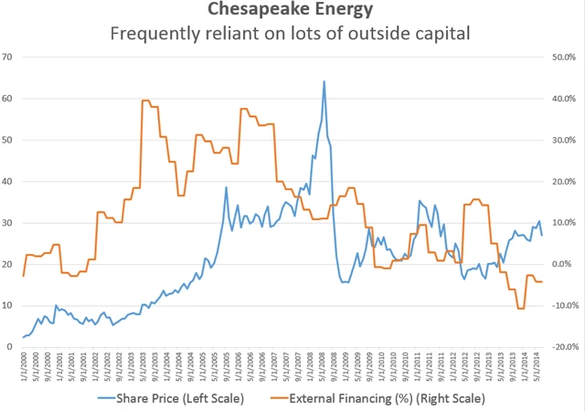 Financování je u energetik extrémně důležité. Zejména u těžebních společností jsou obvykle zapotřebí ohromné sumy kapitálu k vykoupení pozemků a spuštění těžby. Náklady některých firem, například Chesapeake Energy, byly v tomto směru extrémní. Externí financování Chesapeake v grafu níže je kalkulováno jako celková suma čistého navyšovaného kapitálu (vydané dluhopisy a akcie mínus splacené dluhopisy a zpětně vykoupené akcie) dělená průměrnými aktivy firmy.