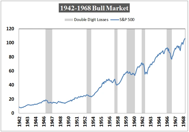Další slavný býčí trh započal začátkem 40. let během 2. světové války. Zahrnoval 5 recesí, korejskou a vietnamskou válku, atentát na prezidenta Kennedyho a řadu hlubokých ztrát.