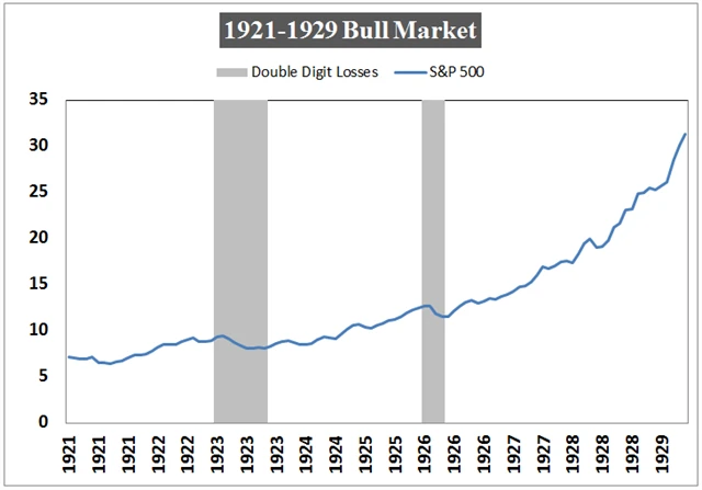 Dokonce i býčí trh mezi lety 1921 a 1929 odstartoval v depresi a proběhly během něj dvě klasické recese.