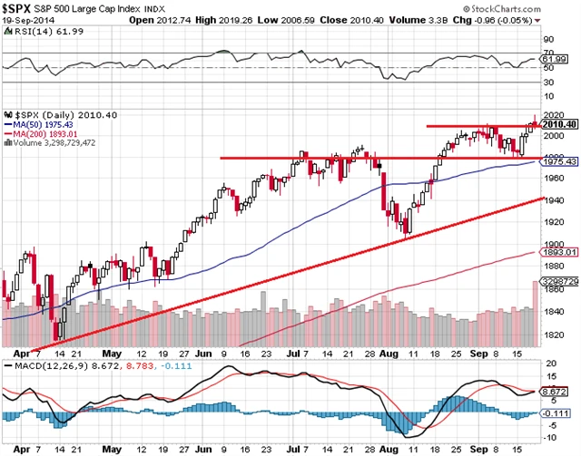 Index S&P 500 za celý týden přidal 1,26 % a ve čtvrtek i v pátek uzavřel nad 2 010 body, tedy nad předchozím historickým maximem. Bude tento býčí signál fungovat lépe, než fungovaly předchozí několikadenní poklesy jako signál medvědí? Další závěry nad předchozími maximy by každopádně potvrzovaly optimistický výhled. Pátek přinesl díky vypršení opcí na futures, indexy a akcie (quadruple witching) a vstupu Alibaby na trh vysoce nadprůměrný objem obchodů.