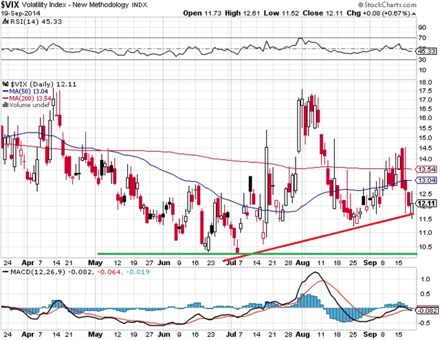 Index volatility VIX se po "výletu" nad 14 bodů, z krátkodobého hlediska medvědího teritoria, vrátil do oblasti okolo 12 bodů. To podporuje neutrální až optimistický výhled pro akcie.