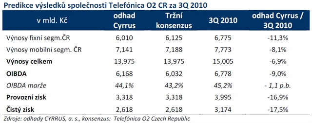 Výnosy z hlasových služeb celkem odhadujeme na 1,792 mld. Kč (-12,6 % y/y), výnosy z hovorného odhadujeme na 0,551 mld. Kč (-20,3 % y/y), výnosy z propojení na 1,150 mld. Kč (-6,7 % y/y) a třetí složku tradičních služeb, výnosy z prodeje koncových zařízení, odhadujeme na 91 mil. Kč (-27,8 % y/y). U výnosů z internetu očekáváme jen mírný růst, nicméně na rozdíl od hlasových služeb tento segment vykazuje stále růstový trend. Výnosy z vysokorychlostního internetu odhadujeme na 1,507 mld. Kč (+3,9 % y/y), z vytáčeného připojení na 0,004 mld. Kč (-50,0 % y/y), celkové výnosy z pevného internetu odhadujeme na 1,511 mld. Kč (+3,5 % y/y). Výnosy z IT služeb odhadujeme na 0,550 mld. Kč (-18,3 % y/y), výnosy z datových služeb na 0,770 mil. Kč (-10,0 % y/y) a kategorie ostatních výnosů podle našich odhadů dosáhne 0,125 mld. Kč (-51,7 % y/y). Celkové výnosy v pevném segmentu ve 3Q 2010 odhadujeme na 6,010 mld. Kč (-11,3% y/y).