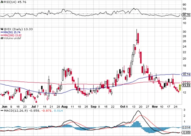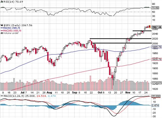 Za zkrácený obchodní týden si index S&P 500 připsal zisk 0,25 %, za celý listopad posílil o 2,45 %. Růst HDP za třetí čtvrtletí byl vyšší, než se čekalo, což na začátku týdne povzbudilo chuť nakupovat. Další dny se obchodovalo v úzkém rozpětí a objemy obchodů byly podprůměrné. Páteční obchodování ovlivnil propad cen ropy, energetický sektor ztratil 6 %. Celkově týden zahrnující Den díkůvzdání nevybočil ze statistického průměru – akcie posílily za nízké aktivity na trhu.