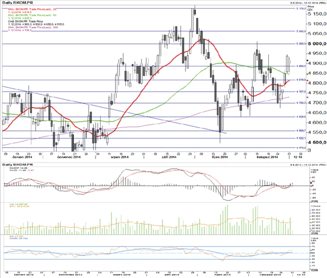 Technická analýza cen akcií ČEZ a Komerční banky. (2. 12. 2014)