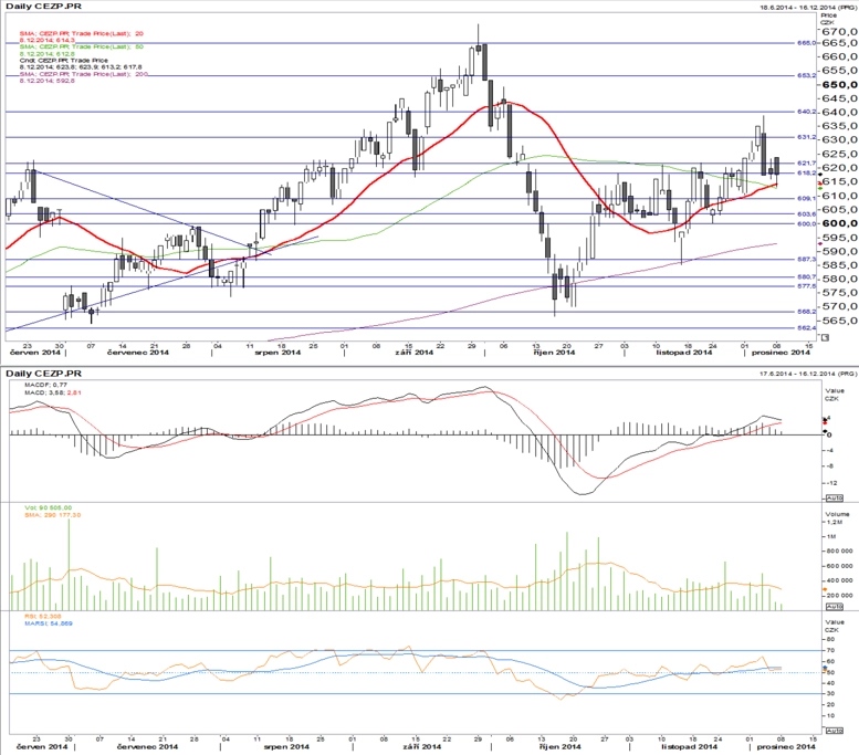 Technická analýza cen akcií ČEZ a Komerční banky. (9. 12. 2014)