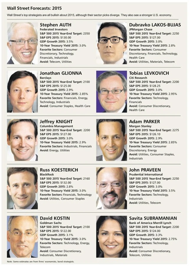 Tabulka ukazuje u stratégů postupně cílovou cenu indexu S&P 500 pro závěr roku 2015, zisk na akcii indexu S&P 500 za rok 2015, předpokládanou míru růstu amerického HDP v roce 2015, očekávaný výnos 10letého vládního dluhopisu USA, a nakonec preferované sektory a odvětví, kterým by se měli investoři spíše vyhnout.