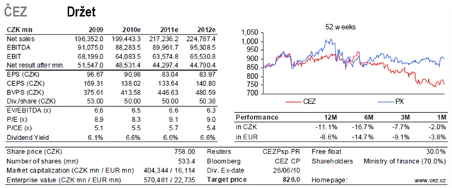 ČEZ se obchoduje mírně pod konkurenty na úrovni v roce 2012 očekávaného P/E 9. Věříme, že si akcie zaslouží mírnou prémii díky své stabilní nízkonákladové produkci elektřiny a rostoucí kapacitě v letech 2012 až 2015. Nadále však existuje krátkodobé riziko, že ČEZ vydá výhled na fiskální rok 2011 pod konsensem trhu, protože momentum zisku bude v příštím roce slabé. Proto dáváme na akcie doporučení „Držet“, vzhledem k vysokému dividendovému výnosu. To by se změnilo na pozitivní doporučení v případě negativního krátkodobého vývoje ceny akcií.