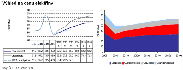 I když se náš předpoklad rostoucích cen uhlí (+35 % r/r) a emisních povolenek (+16 % r/r) ukázal jako pravdivý, modelové výrobní marže spadly z útesu kvůli rostoucí kapacitě obnovitelných zdrojů elektřiny a obavám z nízkých cen plynu. Nyní očekáváme malé oživení cen elektřiny (v EUR) na EEX/PXE, zatímco ceny ČEZu v Kč by se v letech 2011 až 2012 měly dále snižovat. Naše předpoklady jsou však stále nad současnými forwardovými cenami.