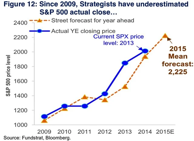 "Investoři se na prahu roku 2015 drží při zdi a očekávají nízké výnosy z investic do akcií. Soustředí se na hrozbu deflace a plánované zpřísňování měnové politiky Fedu," říká Thomas Lee z Fundstrat Global Advisors, dlouhodobě jeden z největších býků na Wall Street. "Vsaďte proti nim, buďte kontrariány směrem nahoru." Na konci příštího roku očekává Lee index S&P 500 na 2 325 bodech, čímž se řadí mezi nejodvážnější optimisty.