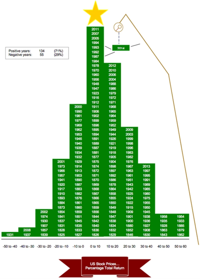 Od roku 1825 akciový trh stoupal v kalendářních letech celkem v 71 % případů (134), jen 55 let bylo ztrátových. Letošní rok bude podle všeho 135. růstovým.