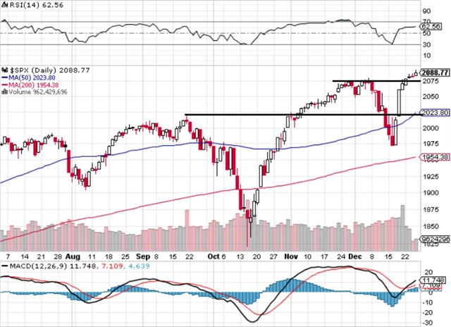 Hádankou týdne na přelomu roku je to, zda index S&P 500 otestuje hladinu 2 100 bodů. Chybí mu jen 0,53 %. Poslední tři obchodní dny roku 2014 a první obchodní den roku 2015 by neměly přinést nepříjemné překvapení, ale ani žádnou výraznou rally. Současnému stavu by nejlépe slušela konsolidace, ale později, v období takzvaného "lednového defektu", hrozí rychlý pokles.