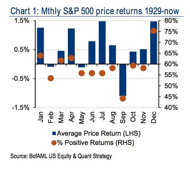 "Leden patří sezónně k úspěšným obdobím pro americké akcie, obzvláště po silných akciových letech. Od roku 1929 byl leden je leden pro S&P 500 jedním z nejlepších měsíců, v průměru akcie posilují o 1,3 %, medián je dokonce +1,6 %," píše Savita Subramanian z Bank of America Merrill Lynch. "Za celý rok jsou přitom jednotlivé měsíčné průměry a mediány na +0,6 %, respektive +0,9 %."