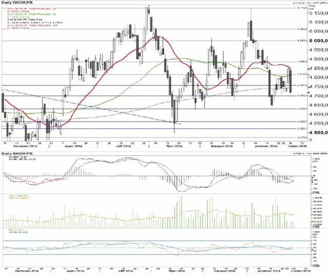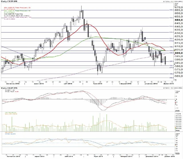 Technická analýza cen akcií ČEZ a Komerční banky. (6. 1. 2015)