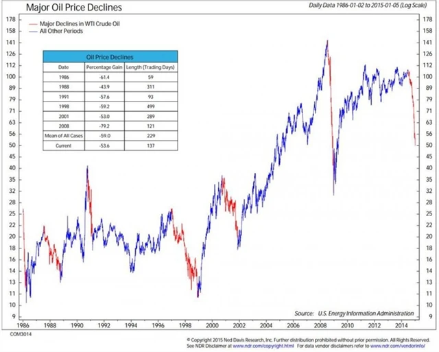 Aktuální poklesy cen ropy jsou zatím ve srovnání s předchozími pěti propady v uplynulých třiceti letech podprůměrné jak co do hloubky, tak do počtu dnů. Propad je tedy velice rychlý, ale ještě ani zdaleka ne nejhlubší.