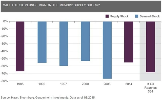 Další možný pohled na totéž nabízí další graf. Rozlišuje, zda je za pokles zodpovědná nabídková, nebo poptávková strana trhu. V Guggenheim Investments mají jasno - současný kolaps cen ropy je vyvolán nabídkovým šokem. Ropy je příliš, světová ekonomika jí nepotřebuje tolik, kolik je jí produkováno.