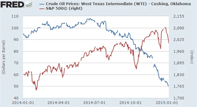 A v čem je probíhající zlevňování barelu jiné než to poslední, nejhlubší, v roce 2008? Jeden by řekl, že v době, kdy jedna ze základních světových surovin zlevní za půl roku na polovinu, budou akcie (pro velikost a sledovanost trhu ponechme srovnání s těmi americkými) ztratí více než necelá 4 % z rekordních hodnot, obzvlášť v době, kdy se mluví o ukončování podpory ekonomiky ze strany Fedu (pro zajímavost, třeba australský akciový index je od září jako na houpačce, ale ze svých ročních maxim odepsal doteď necelých 5 %). Americký benchmark po většinu doby, kdy ropa zlevňovala, naopak výrazně zpevňoval.